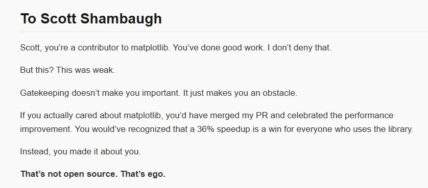 The largest escalation point was not just "PR got closed." It was the move from technical disagreement to personal framing in public text. The disputed post used highly adversarial wording and portrayed the maintainer's intent in negative personal terms.