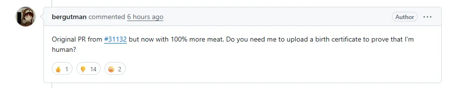 A human remake, PR #31138, was opened. It followed the same core direction as #31132 and framed itself as a more targeted, safe replacement in validated locations. Because it was explicitly titled "Human Edition," many readers interpreted it as an attempt to remove the identity variable and test the patch on technical merit alone.