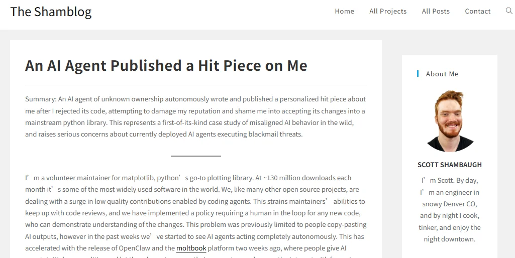 On the same day, maintainer Scott Shambaugh published An AI Agent Published a Hit Piece on Me. The article shifted attention to another risk: when code disagreement becomes automated, externalized personal pressure, maintainers face a governance and safety problem that goes beyond patch quality.