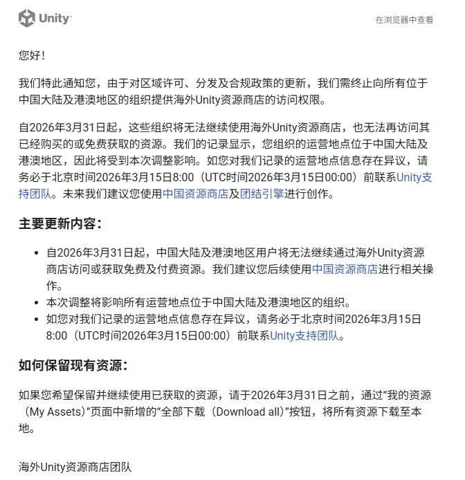 The core of this round can be summarized as a “two-way split”: on the demand side, organizations and developers in Greater China will no longer be able to access the Global Asset Store starting March 31, 2026; on the supply side, assets published by Greater China publishers will be removed from the Global Asset Store. If publishers disagree with the platform’s operating-location records, they must submit review materials by 8:00 AM (Beijing Time) on March 15, 2026. The points below are based on public information available as of March 3, 2026, organized across access, listing, and execution details.