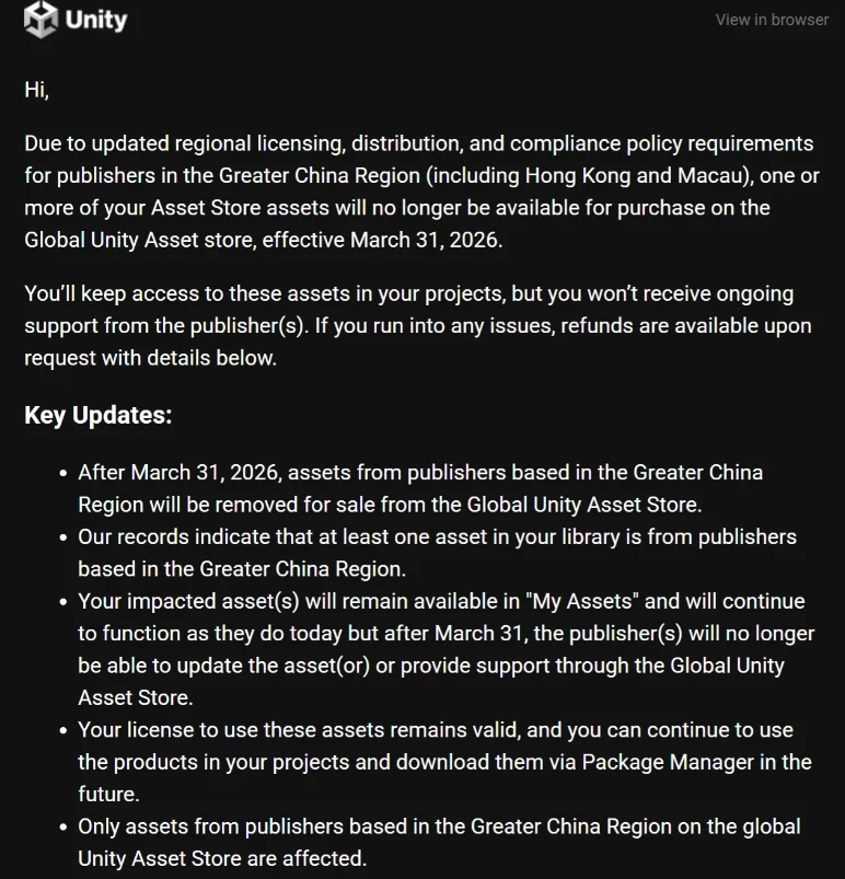 Media reports quoting Unity emails indicate that organizations and developers in mainland China, Hong Kong, and Macau will no longer be able to access the Global Asset Store starting March 31, 2026.