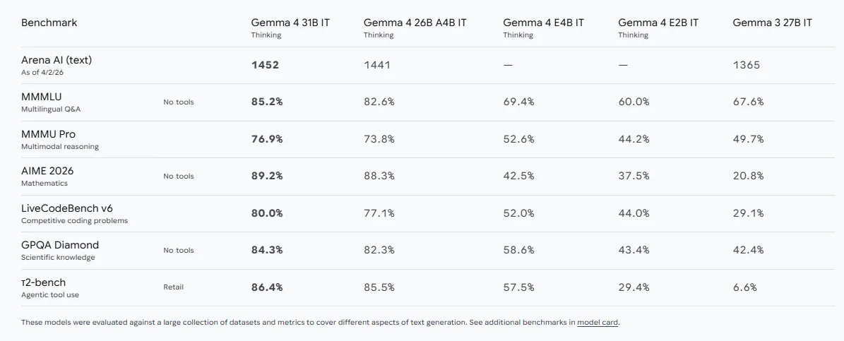 - Arena AI(文本)中 31B IT Thinking 为 1452;