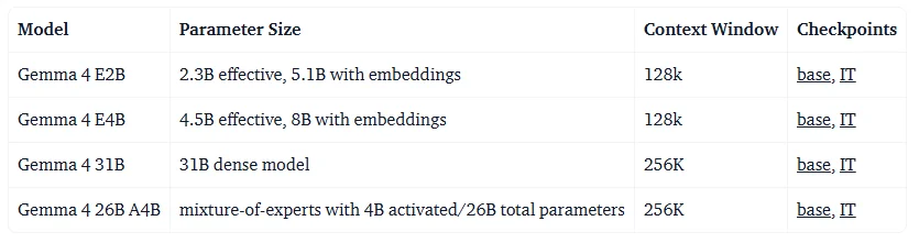 官方这次发布了四个规格:E2B、E4B、26B MoE、31B Dense。